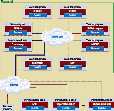 В качестве ПО используется Domino/Notes — система клиент—сервер компании Lotus Development (подразделения корпорации IBM); серверная часть этой системы называется Domino, а клиентская — Notes. Структура сети Macronet имеет иерархический характер: главным является центральный узел, расположенный в Госстандарте, базовым — узел во ВНИИ классификации, терминологии и информации по стандартизации и качеству (ВНИИКИ), а остальные московские узлы обладают статусом опорных. На данный момент в системе Macronet установлено 28 серверов Domino и около 400 клиентов Notes (в качестве серверной ОС используется Windows NT). Кроме того, имеются локальные и региональные узлы, не входящие в Macronet, но взаимодействующие с этой сетью через каналы удаленного доступа (прямое соединение по модему или по Internet). Региональные узлы принадлежат министерствам, предприятиям и ведомствам, расположенным за пределами Москвы, а опорные и локальные — центрам сертификации и метрологии (ЦСМ), находящимся во всех регионах РФ. Все московские узлы сети Macronet объединены через выделенные линии компании Golden Line (скорость передачи 64 кбит/с и 2 Мбит/с), а региональные и локальные узлы подключаются через местных провайдеров Internet (см. рис. 1). Всего в сети 68 серверов и около 2000 клиентских мест.