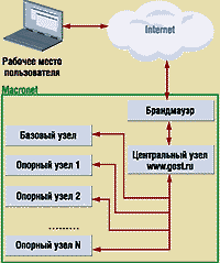 Хотя любая информация, хранящаяся на каждом из узлов Macronet, принадлежит какой-то конкретной организации, для пользователя система является единым информационным пространством. Физически выход в Internet имеется только на центральном узле, а базовый и опорные узлы не обладают самостоятельными каналами доступа в Internet и используют для этого средства сети Macronet. Вход в систему осуществляется через главный узел (http://www.gost.ru), который содержит ссылки на все остальные Web-узлы системы. Путешествуя по Web-страницам, можно переходить с одного узла на другой, не задумываясь, на каком из них в данный момент находишься.
