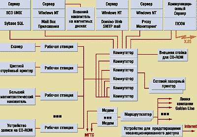 Центральный узел служит для управления сетью Macronet и единой информационной средой и включает в себя шесть серверов и около 200 рабочих мест, объединенных в локальную сеть через пять концентраторов типа Hub 10TX и коммутатор Switch LAN Plex 1000 (рис. 2). Для связи с другими узлами сети Macronet и внешним миром предназначена подсистема из двух маршрутизаторов Cisco 45 и 47, имеющая выходы через систему Golden Line на базовый и опорные узлы, а также на провайдера Internet. Кроме того, предусмотрено и альтернативное средство связи с узлами Macronet и мобильными пользователями через блок модемов с прямым выходом в МГТС. Что касается остальных узлов, то они менее мощные, чем центральный. Так, в локальной сети базового узла имеются два сервера, концентратор и маршрутизатор, в сетях опорных и региональных узлов — по одному серверу и концентратору, в сетях локальных узлов — один сервер или одна рабочая станция.