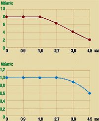 | Рисунок 4. Скорость передачи данных в зависимости от расстояния: а — направление оператор — пользователь (downstream); б — направление пользователь — оператор (upstream) |