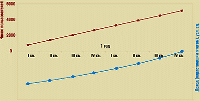 Результаты моделирования, подтверждающие экономическую целесообразность создания сети начальной емкостью 5000 абонентов, приведены на рис. 1. В качестве базовых параметров для расчета были выбраны следующие показатели: стоимость подключения — 200 долл., средний трафик — 500 Mбайт/мес., абонентная плата — 55 долл./мес., оплаченный объем трафика (в рамках абонентной платы) — 50 Mбайт, тариф на трафик — 0,12 долл./Mбайт (сверх 50 Мбайт).