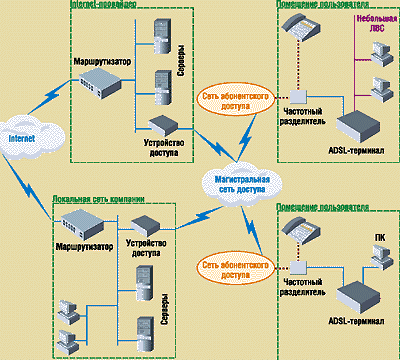 Подсистема абонентского доступа включает в себя абонентские ADSL-терминалы, узлы доступа оператора на базе DSL-концентраторов (DSLAM), телефонную распределительную сеть, абонентские и станционные частотные разделители. DSLAM концентрирует поступающий от абонентских терминалов трафик в один мощный цифровой поток и направляет его в подсистему магистрального доступа.