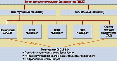 Техническая реализация такой сети (рис. 1) — Единой телекоммуникационной банковской сети (ЕТКБС) — на сегодняшний день должна осуществляться с использованием современных систем связи и передачи данных: радиорелейных, волоконно-оптических, спутниковых. Последние не случайно занимают особое место в составе ЕТКБС. Спутниковые системы связи (ССС) и передачи данных способны обеспечить необходимую быстроту развертывания и реконфигурации системы, надежность и качество связи, независимость тарифов от расстояния, простоту в обслуживании и ремонте; по спутниковым каналам, обладающим высоким коэффициентом готовности, передаются практически любые виды трафиков.