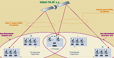 Земной сегмент ВССС, построенный в том числе и на станциях Кu-диапазона корпорации NEC и состоит (см. рис. 3) из ЦЗС, системы управления (СУ) сетью и региональных подсистем, в каждую из которых входят узловая земная станция (УЗС) и до 50 абонентских земных станций (АЗС). ЦЗС находится в зоне обслуживания КА. УЗС размещаются в ГУ (НБ) областей, краев и республик, а АЗС — в соответствующих РКЦ. Наличие на центральной ЗС двух антенных постов позволяет в случае необходимости работать с двумя КА одновременно. ССС полного состава будет включать около 1200 ЗС, причем их количество для сетей «Банкир-1», «Банкир-2» и «Банкир-3» соотносится примерно как 6:5:1. Сегодня развернуто уже более 600 ЗС (свыше 50% от общего числа), а в эксплуатации находятся около 300 станций (25% от общего числа). Существующая сеть предоставляет следующие услуги: