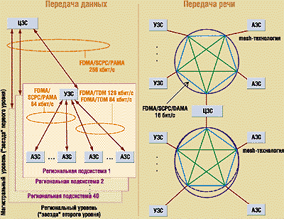 Передача данных осуществляется (рис. 4) по закрепленным спутниковым каналам (PAMA) на магистральном уровне и по спутниковым каналам с временным разделением (TDMA) и PAMA на региональном уровне.