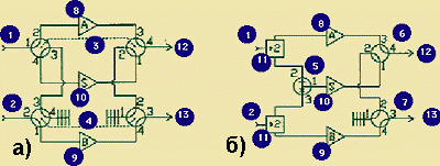 Для обеспечения резервирования по схеме 1:2 (рис. 3) необходимы три усилителя, два из которых работают на полезную нагрузку, а третий находится в резерве. При возникновении неисправности в любом из двух работающих усилителей автоматически включается резервный. Реализация такой схемы тоже требует дополнительного комплекта оборудования: монтажной рамы, двух спаренных волноводных переключателей и двух оконечных нагрузок (рис. 3,а).