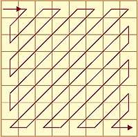 Каждый блок подвергается двумерному дискретно-косинусному преобразованию, являющемуся основой практически всех методов сжатия изображения. Сканирование пикселов внутри блока происходит зигзагообразно, как показано на рис. 2. Такой алгоритм обеспечивает длинные последовательности нулевых значений в полученной матрице коэффициентов. В дальнейшем этот массив уменьшается за счет «выбрасывания» нулевых значений, причем передается только информация о количестве нулей. Затем табличным методом происходит преобразование в кодовую последовательность с переменной длиной слова. Часто встречаемые значения кодируются словом меньшей длины. Таким образом дискретно-косинусное преобразование значительно уменьшает объем передаваемых данных.
