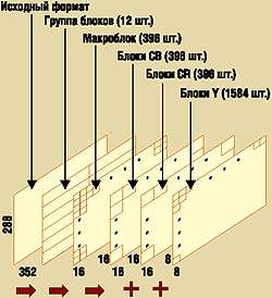 На рис. 1 показан принцип разложения кадра на блоки для формата CIF. Используется иерархическая четырехуровневая схема: кадр — группа блоков (GOB, group of blocks) — макроблок (MB, macroblock) — блок. Как видно из рисунка, кадр формата CIF содержит 12 групп блоков по 33 макроблока в каждой, а формат QCIF — только три группы. Рекомендация Н.263 описывает в составе кадра 18 групп блоков для CIF и 9 для QCIF.