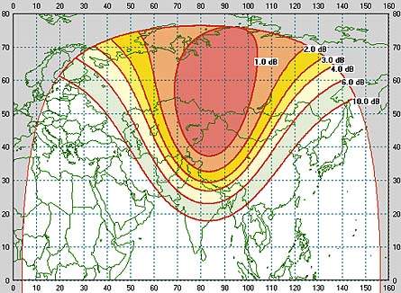 В рамках заключенного между двумя организациями соглашения предусматривается создание совместного предприятия по разработке нового спутника, который намечено вывести в орбитальную позицию 40? в.д. не позднее 2002 г. Создаваемый КА будет оснащен 8 транспондерами C-диапазона и одним L-диапазона (их ГПКС планирует использовать для своих нужд), а также не менее чем 16 стволами Ku-диапазона (предназначены для Eutelsat). Его орбитальная позиция близка к точке стояния недавно введенного в эксплуатацию SESAT (36? в.д.) и чрезвычайно важна для расширения спутниковых емкостей вблизи этих координат. Зона покрытия нового КА (см. рисунок) позволит дополнительно охватить Центральную и Восточную Европу, страны Средиземноморья, арабского региона и южной части Азии.