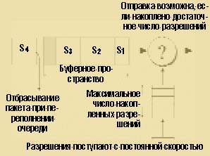 Введение в данную схему буфера превращает простой фильтр в формирователь трафика (рис. 2). В этом случае входящие пакеты организуются в очередь и ожидают накопления такого числа разрешений, которое достаточно для их передачи. Тогда потери пакетов происходят лишь при переполнении очереди.