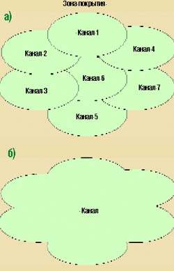 | Зоны покрытия: а) систем на базе сот (каждая БС использует свой набор частот); б) при организации связи через ретрансляторы (один и тот же набор частот используется всеми БС) |