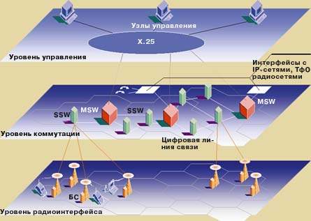 Структуру радиосети можно представить в виде нескольких уровней взаимодействия оборудования (рис. 1). На уровне радиоинтерфейса сотовая или транкинговая архитектура системы выбирается в зависимости от предполагаемых объемов трафика и наличия частот. Уровень коммутации обеспечивает связь между различными ячейками (в терминологии Siemens — сотами) и служит для маршрутизации вызовов, поддержки функций мобильного управления и внешних подключений. На уровне управления сетью осуществляются конфигурирование оборудования и контроль за работой сети.