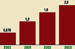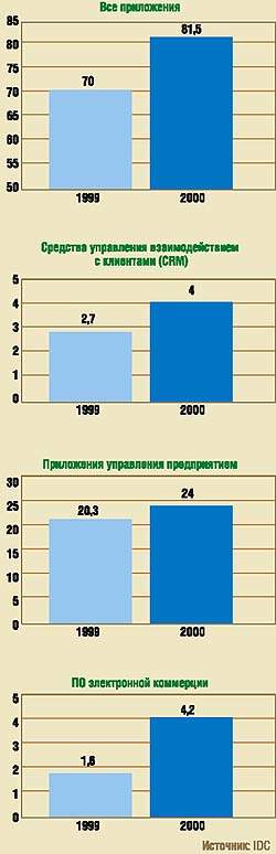 Согласно прогнозам IDC, в текущем году объем мирового рынка приложений и сопутствующих услуг составит 70 млрд долл. В 2004 г. он превысит 300 млрд долл., причем только половина этой суммы будет приходиться на само программное обеспечение, а остальное — на консалтинг, сопровождение и прочие услуги.