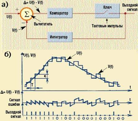 | Принципы работы дельта-модулятора: а) структурная схема; б) форма сигнала (T — шаг дискретизации, e — ступенька квантования, U(t) — входной аналоговый сигнал, V(t) — аппроксимирующее напряжение) |