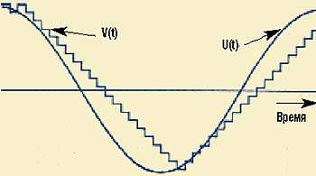 | Перегрузка по крутизне гармоническим сигналом при ДМ с постоянным шагом приращения аппроксимирующего напряжения (U(t) — входной аналоговый сигнал, V(t) — аппроксимирующее напряжение) |