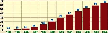 1999 г. стал чрезвычайно удачным для технологии DECT и подтвердил все самые оптимистические прогнозы ее развития. Мировой объем продаж оборудования DECT за этот год составил около 20 млн изделий (из них 18 млн — домашние, 750 тыс. — офисные системы, а 1 млн — системы абонентского радиодоступа). Рост продаж по сравнению с 1998 г. превысил 50 %. Заметим, что в 1999 г. на рынке появились DECT-продукты, обеспечивающие передачу данных. Думается, что в связи с этим фактом прогнозируемый на 2000 г. объем продаж (около 30 млн терминалов) станет реальностью.