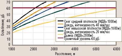 | Рис. 1. Зависимость ослабления сигнала от расстояния при различных метеофакторах |