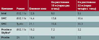 Прежде всего любопытны значения информационной пропускной способности, зарегистрированные при разных скоростях модуляции сигнала. При минимальной скорости модуляции (6 Мбит/с) пропускная способность составила 4,6 Мбит/с, при максимальной (54 Мбит/с) — 28,3 Мбит/с. Последнее значение чуть ли не вдвое превышает величину, полученную сотрудниками тестовой лаборатории еженедельника Network World (см. таблицу). Впрочем, это различие можно объяснить несхожестью сетевых конфигураций.