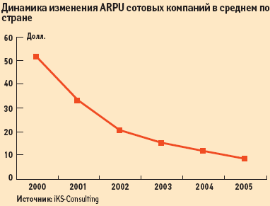 В частности, у операторов «большой тройки» показатель EBITDA Margin находится на уровне 50% и выше. Зато их доходы в пересчете на одного абонента (ARPU) значительно ниже, чем у зарубежных коллег, и продолжают стремительно сокращаться. Исследования IKS-Consulting подтвердили, что по итогам 2004 года средний показатель ARPU в России снизился на 21% (до 11,9 долл.), что втрое меньше, чем в Европе, и впятеро меньше, чем в США. За первое полугодие 2005 года ARPU упал до 9 долл., а в целом за 2005 год ожидается его снижение на 27% (до 8,7 долл.).