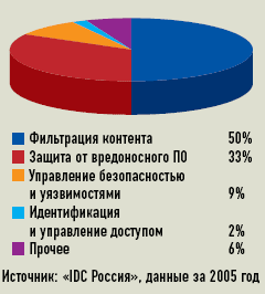 Исследования IDC также показывают, что распределение средств, вкладываемых российскими предприятиями в сферу ИБ, не соответствует первоочередным заботам о непрерывности бизнеса. В 2005 году структура затрат отечественных компаний в данной сфере выглядела так: половина затрат пошла на решения для фильтрации контента, 33% — на инструменты для защиты от malware, 9% — на системы управления ИБ и уязвимостями, 2% — на функционал идентификации пользователей и управления доступом. Есть все основания полагать, что в ближайшее время распределение затрат изменится. Солидные фирмы пришли к осознанию важности грамотной системы ИБ и интересуются средствам защиты «первой необходимости». Речь идет о разработках для управления идентификацией и контролем над доступом.