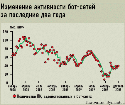 В свою очередь, сеть предприятия, особенно его Web-сайт, становится объектом атаки со стороны ботнетов. По данным Андрея Бугаенко, директора по информационным технологиям компании «Синтерра», стоимость атаки класса DDoS, проводимой с помощью ботнетов, начинается от 30 долл. За 100 долл. в день злоумышленники готовы организовать атаку, мощность которой эквивалентна потоку запросов от 100 до 400 Мбит/с.