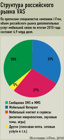 О ситуации в России рассказал Кирилл Петров, управляющий директор i-Free Innovations (компания i-Free выступила платиновым спонсором прошедшего форума). По его словам, объем российского рынка VAS по итогам 2010 года составит 4,9 млрд долл. — примерно на миллиард больше, чем годом ранее. Рост этого показателя при почти неизменных доходах операторов от голосовых услуг привел к тому, что в совокупной выручке сотовых компаний доля дополнительных услуг возросла с 19 до 21%.