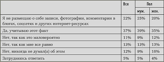 Исследовательский центр рекрутингового портала Superjob.ru выяснил, что, размещая записи в соцсетях и блогах, только 37% экономически активных россиян, пользующиеся Интернетом, задумываются о том, как на это отреагирует потенциальный работодатель. По словам опрошенных, они отдают себе отчет в том, что их активность в сети может быть неправильно понята работодателем. Некоторые при этом блокируют содержимое страничек от просмотра посторонними лицами, другие размещают записи анонимно, третьи не публикуют ничего личного. Интересно, что мужчины осторожничают несколько чаще женщин: то, что с размещаемой ими в Интернете информацией могут ознакомиться представители компаний, учитывают 39% из них (против 35% среди дам).