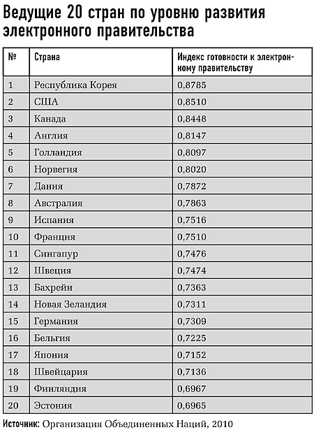 Индекс ООН, определяющий готовность стран к реализации концепции электронного правительства (E-Government Readiness Index), учитывает развитие телекоммуникационной инфраструктуры в стране (Telecommunication Infrastructure Index), уровень образования населения и его готовность к использованию информационных технологий (Human Capital Index), а также собственно развитие электронных форм взаимодействия правительства с населением (Supplementary e-Participation Index). Исследование ООН показало, что по совокупности этих критериев наша страна заметно отстает и находится где-то в середине списка, между Саудовской Аравией и Черногорией. Удивительно, но мы значительно уступаем и нашим ближайшим соседям — Казахстану, Украине, Монголии и многим другим.