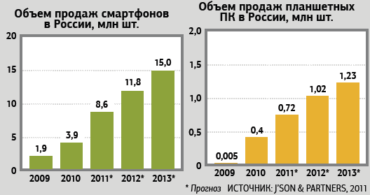По прогнозам J’son & Partners Consulting, к 2013 году объем продаж смартфонов составит в России 15 млн устройств в год, а объем продаж планшетных ПК — 1,23 млн шт.