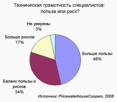 Руководство большинства компаний уверено, что к 2013 году сотрудники компаний будут настолько технически подкованными, что смогут без проблем работать со всем информационным инструментарием. Оптимизм относительно этого выразило 82% бизнес-руководителей, опрошенных PricewaterhouseCoopers. В крайнем случае, персонал будет способен освоить нужные ИТ-решения в кратчайшие сроки. В том числе, речь идет и о сотрудниках низшего уровня. Довольно оптимистичны руководители и в видении своего будущего: 75% полагают, что через пять лет будут ясно представлять, каким образом каждая технология помогает в осуществлении бизнес-целей. Тем не менее, повышение роли технологий и растущая техническая грамотность персонала вызывают и определенную озабоченность. Значительная часть руководителей видит в этом рост рисков для компании. Тем не менее, большинство признает, что польза от технически грамотных сотрудников гораздо больше возникающих рисков.