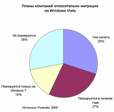 Почти треть европейских и американских компаний начала использование Windows Vista, как подсчитали аналитики Forrester. Таким образом, лишь через два года после выхода этой операционной системы среди ИТ-менеджеров наметилось определенное «потепление» по отношению к ней. На данный момент ее проникновение в корпоративную ИТ-структуру составляет около 10% - в среднем именно такой процент компьютеров работает на Vista. Кроме того, еще 27% планируют начать ее использование в течение 2009 года. Однако на эти планы может повлиять экономическая нестабильность: как правило, Vista приобретается с новыми компьютерами, а именно расходы на «железо» являются первыми претендентами на сокращение при оптимизации ИТ-затрат. 15% опрошенных сказали, что минуя Windows Vista, планируют перейти сразу на платформу Windows 7, выход которой должен состояться в начале 2010 года. Еще 28% заявляют об отсутствии каких-либо планов миграции. В их числе 3%, использующих Mac OS X, а также 2% пользователей Linux.