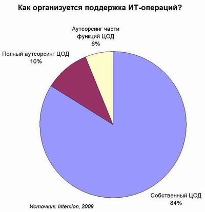 Все больше компаний встают перед перспективой масштабных инвестиций, связанных с построением новых ЦОД. Это связано с тем, что они «вырастают» из существующих центров. По данным компании Interxion, в течение ближайшего года с такой проблемой столкнутся 40% компаний. В условиях кризиса нехватка мощностей и площадей информационных центров создает благоприятные условия для провайдеров услуг ЦОД. В настоящее время 84% компаний предпочитают осуществлять поддержку ИТ-операций с помощью собственных ЦОД. 10% прибегают с аутсорсингу – аренде серверов или размещению собственных серверов на площадях провайдера. Остальные пришли к необходимости сочетания этих двух подходов. Однако сложившаяся обстановка приводит к тому, что компаниям в ближайшие несколько лет будет крайне проблематично расширить мощности собственных информационных центров. В результате к услугам аутсорсинга ЦОД начинают обращаться даже компании-гиганты.