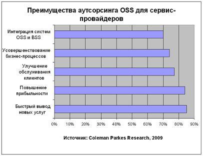 Исследование, проведенное компанией Coleman Parkes Research по заказу Amdocs в апреле 2009 года, свидетельствует, что более половины сервис-провайдеров (67% из опрошенных) предпочли бы отдать на аутсорсинг поддержку решений BSS и OSS (систем поддержки бизнеса и операционной деятельности). Почти 88% опрошенных считают, что долгосрочный аутсорсинг OSS сокращает операционные расходы. Кроме того, поставщики услуг называют наиболее важными в условиях современного рынка следующие преимущества аутсорсинга OSS: