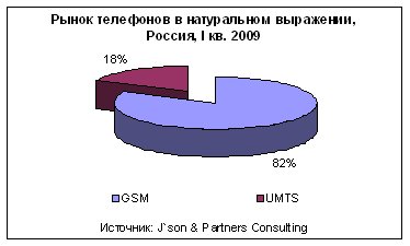 По оценке J'son & Partners Consulting, в I кв. 2009 года в России было продано 1,2 млн UMTS-телефонов. Несмотря на то, что в целом российский рынок мобильных телефонов в I кв. 2009 года продемонстрировал отрицательную динамику по сравнению с показателями за аналогичный период прошлого года, продажи 3G-терминалов в натуральном исчислении выросли примерно в 1,5 раза. В денежном выражении объем продаж 3G-терминалов в I кв. 2009 года превысил отметку 370 млн долл. Средняя розничная цена UMTS-телефона незначительно снизилась в сравнении с аналогичным показателем за I кв. 2008 года - снижение составило около 17%. Продажи UMTS-терминалов за рассматриваемый период составили около 18% всего российского рынка мобильных телефонов в натуральном исчислении; при этом продажи этих устройств сформировали около 39% рынка в денежном выражении. Это объясняется тем, что UMTS-терминалы обладают более высокой средней стоимостью, чем обычные GSM-телефоны.