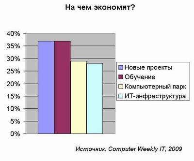 Более половины компаний во время экономического кризиса существенно сократили свои расходы на ИТ. Кроме того, почти треть из них были вынуждены увольнять своих ИТ-сотрудников. По данным Computer Weekly IT, наибольшие сокращения бюджета и персонала произошли в крупных организациях со штатом более 1 тыс. человек. Если в среднем сокращение ИТ-бюджета составило около 10%, то среди крупных компаний оно достигло 20%. Кроме того, именно в крупных компаниях большинство ИТ-проектов отложили до лучших времен, что привело к увольнению многих специалистов, участвовавших в разработках. Кроме того, более 10% компаний, в которых еще не проходило никаких увольнений, допускают, что в течение полугода будут вынуждены пойти на это. Сокращение бюджета сильнее всего коснулось обучения сотрудников и реализации новых проектов – их отмечают среди главных источников экономии 37% компаний. Далее среди наиболее пострадавших частей ИТ-бюджетов следуют расходы на обновление компьютерного парка и ИТ-инфраструктуру. Однако при этом в 38% компаний отмечают, что у них ИТ-бюджет в отношении этих областей не был урезан вообще.