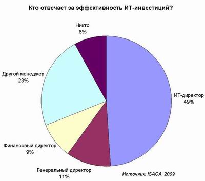 Две трети компаний не полностью измеряют эффективность осуществляемых ИТ-инвестиций. Как показал опрос, проведенный организацией ISACA, большая часть компаний в формализованном виде демонстрирует руководству чуть более половины ожидаемых эффектов от инвестиций в ИТ. Еще 20% проводят оценку эффективности «в некоторой степени», а 10% - не проводят вовсе. В связи с этим у аналитиков возникает вполне естественный вопрос: «А на каких же основаниях принимаются решения об ИТ-инвестициях?» Без четкого измерения результатов проблематично сказать, какие инвестиции являются вполне успешными, а какие должны быть сокращены. Другой важной проблемой является явно недостаточная ответственность бизнес-руководства за эффективность инвестиций. В почти половине компаний за возврат инвестиций в ИТ отвечает ИТ-директор. Гораздо реже ответственным за это является генеральный или финансовый директор, а также другой член совета директоров. Что интересно, 8% опрошенных заявили о полном отсутствии менеджеров, ответственных за эффективность ИТ-инвестиций.