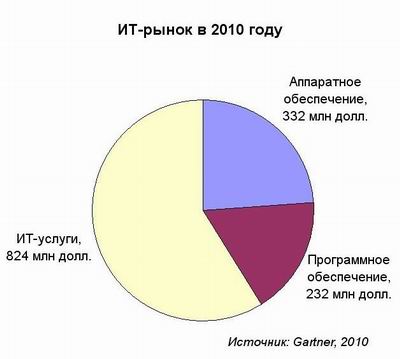 , что на 4,6% выше показателя 2009 года. Хотя этот рост и является весьма скромным, он вселяет оптимизм по сравнению с прошлогодней картиной, когда ИТ-расходы компаний сократились на те же 4,6%. Фактически, рынок в ходе 2010 года вернется к состоянию 2008 года. Рост, хотя и различный по динамике, будет наблюдаться во всех сегментах рынка. Наиболее активным станет сегмент ИТ-услуг, где рост может составить 5,6%, а самым сдержанным – сегмент аппаратного обеспечения, где будет наблюдаться лишь незначительное увеличение. С региональной точки зрения аналитики ожидают наиболее активный рост в странах Латинской Америки и Азии.