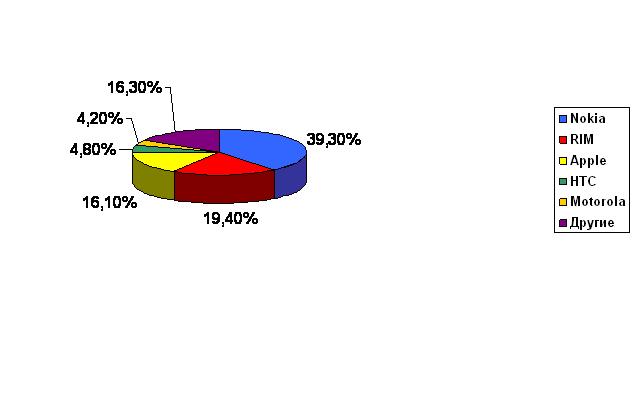 Крупнейшими поставщиками смартфонов в первом квартале 2010 года стали Nokia с рыночной долей 39,3%, Research In Motion (19,4%) и Apple (16,1%). Замыкают пятерку лидеров HTC (4,8%) и Motorola (4,2%).