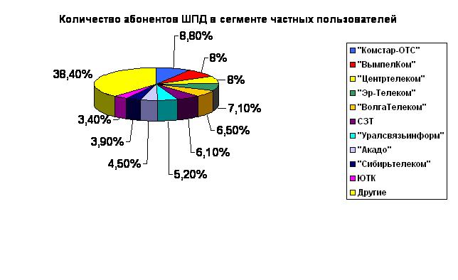 Десять крупнейших операторов обслуживают 62% абонентской базы ШПД в России. По числу частных пользователей по итогам первого квартала лидирует "Комстар-ОТС" с долей 8,8%, далее следуют "ВымпелКом" (8%) и "ЦентрТелеком" (8%). Замыкают пятерку лидеров "Эр-Телеком" (7,1%) и "ВолгаТелеком" (6,5%). Наиболее высокий прирост абонентской базы относительно показателя последнего квартала 2009 года продемонстрировали операторы ЮТК, "Сибирьтелеком" и "ВымпелКом".