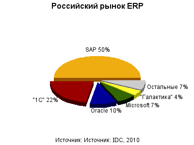 Лидером российского рынка систем управления предприятием осталась компания SAP, контролирующая ровно его половину. «1С» и Oracle закончили год с 22% и 10% рынка, заняв второе и третье место соответственно. Microsoft Dynamics (7%) стала четвертой, а «Галактика» (4%) замкнула пятерку лидирующих поставщиков.