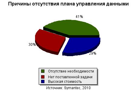 Ситуацию осложняет и то, что в ряде компаний ИТ-менеджеры вообще не видят необходимости в плане управления данными. Кроме того, 30% заявили, что бизнес-руководством не было озвучено такой задачи, а 29% назвали причиной отсутствия плана его высокую стоимость.