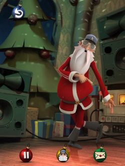 (например, Jingle Bells), автоматически подстроив тембр и ритм. После нажатия на кнопку воспроизведения ваше сообщение на выбранную мелодию пропоет анимированный Санта-Клаус. При этом записанные вами слова сохраняются и звучат четко и разборчиво. С Сантой также можно поиграть — пощекотать ему живот, нажать на нос или подергать за руки и за ноги, чтобы заставить двигаться. Если долго оставаться в бездействии, он ткнет в вас микрофоном, демонстрируя, что ему скучно.