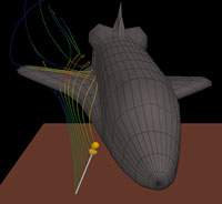 3D-виджеты (объекты, инкапсулирующие 3D-геометрию и предназначенные для управления другими объектами в сцене) начинают с успехом использоваться в задачах трехмерного моделирования; при этом они являются частью 3D-сцены, что позволяет не прибегать к привычным 2D-виджетам, обычно накладываемым на 3D-сцену. В качестве примера сошлемся на 3D-компоненты виджета "рычаг", которые используются для манипулирования элементами в скалярном поле, полученном с помощью числового моделирования потоков воздуха вокруг модели космического челнока (рис.1).