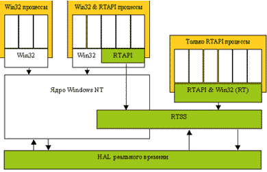 RTAPI обеспечивает необходимый набор программных расширений в дополнение к Win32 API. Вместе с Win32(RT) - подмножеством функций Win32 - RTAPI реализует полнофункциональный набор интерфейсов прикладного программирования. RTAPI может использоваться как RTX так и NT процессами, поэтому создаваемые приложения переносимы и способны работать в той и другой среде. Поскольку RTAPI функционирует в среде Windows NT, можно использовать любые средства разработки для создания программ, ориентированных на обе среды.