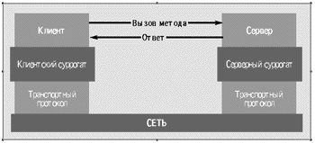 Для того чтобы реализовать эту схему, на стороне клиента и на стороне сервера поддерживаются специальные компоненты, носящие название клиентский и серверный суррогаты (client stub и server stub). Для того чтобы вызвать ту или иную функцию, клиент обращается к клиентскому суррогату, который упаковывает аргументы в сообщение-запрос и передает их на транспортный уровень соединения. Серверный суррогат распаковывает полученное сообщение и в соответствии с переданными аргументами вызывает нужную функцию, или нужный метод объекта, если речь идет об объектном варианте RPC. В СОМ клиентский суррогат называется proxy, а серверный — stub. В CORBA клиентский суррогат не имеет специального названия, а серверный обозначают термином skeleton.