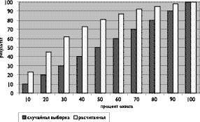 Процент охвата Количество потенциальных клиентов при случайной выборке. Количество потенциальных клиентов при выборке по модели абсолютная величина % абсолютная величина % 10 80 10 184 23 20 160 20 360 45 30 240 30 496 62 40 320 40 584 73 50 400 50 648 81 60 480 60 696 87 70 560 70 736 92 80 640 80 760 95 90 720 90 784 98 100 800 100 800 100 Большую пользу в оценке полезности модели могут оказать графики «подъема» и рентабельности (возврата инвестиций). Первый график показывает, как изменяется ответ (количество откликов на целевую рекламу, количество сохранённых клиентов и др.) при применении модели. Второй график учитывает стоимость модели и ее применения, так как модель сама по себе может быть очень интересная, но ее применение не окупит затрат на её построение. Значение этих графиков станет боле понятным из следующего примера: Пусть фирма проводит целевую рекламу (рассылку рекламы по определенным адресам). Количество кандидатов, которое она хочет охватить, возьмем равным 10000. Это могут быть как физические, так и юридические лица. Из них, количество потенциальных клиентов - 800 (эту величину можно оценить, сделав контрольную рассылку в группе, равной величине репрезентативной выборки). Если случайным образом выбрать 10% из общего списка, то есть 1000 кандидатов, то в эту группу потенциальных клиентов тоже попадет 10% от их общего числа, то есть 80. Если же 1000 кандидатов выбирать с помощью модели, то количество потенциальных клиентов в этой группе будет значительно больше. Предположим, что оно будет таким, как показано в таблице 1.
