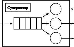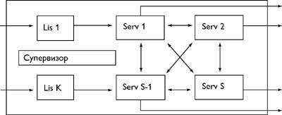 Схема универсального сервера представлена на рис.1. Как видно из рисунка, сервер состоит из модулей трех типов: управляющий модуль (Supervisor), приемники (Lis 1 - Lis K) и сервисы (Serv 1 - Serv S). В задачи управляющего модуля входят обеспечение запуска и остановки сервера, распределение ресурсов компьютера между модулями, сбор и визуализация статистики. Приемник обеспечивает получение запроса от клиента и передачу его одному из сервисов. Задача сервиса - принять клиентский запрос от приемника, обработать и либо сообщить клиенту о завершении обработки (успешном или ошибочном), либо передать частично обработанный запрос другому сервису. Все сервисы имеют одинаковую структуру (рис.2), различия между ними заключаются лишь в логике функционирования обработчиков.