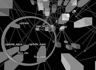 Чтобы проанализировать производительность приложения CSAR, мы создали визуализацию реального времени, детально описывающую исполнение кода на SGI Origin 2000 в NASA. Визуализация состоит из трех уровней. На самом высоком уровне, показанном на рисунке 4, географическое изображение демонстрирует логическую связь глобальной сети, объединяющей несколько суперкомпьютеров и национальные лаборатории в континентальной части США. Наша модифицированная маршрутная программа Trace, расширенная за счет датчиков Autopilot, собирает данные о задержке, которые Virtue указывает как канал соответствующего цвета. Хотя приложение CSAR сейчас исполняется только на одной параллельной системе в каждый момент времени, географическая визуализация позволила нам проверить возможности Virtue по визуализации сетевого трафика в реальном времени.
