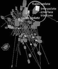 На среднем уровне иерархии изображения мы представили деятельность процессоров и данные по обмену сообщениями при выполнении приложения на одной платформе с использованием возможностей параллельной обработки. Мы добавили в исходный текст датчики с помощью SvPablo, чтобы выяснить структуру вызова процедур в приложении. Мы также добавили датчики Autopilot, чтобы узнать входные и выходные значения логических фрагментов кода и получить информацию об обмене сообщениями MPI. Выбирая узел NCSA на географическом изображении, пользователи могут «углубиться» в изображение в формате временных туннелей, созданное на основе данных Autopilot. Цвет каждого фрагмента временной линии указывает на исполняемый в данный момент фрагмент кода (например, потоки жидкости или структуры) на каждом из процессоров. На рисунке 5, к примеру, желтые временные линии соответствуют исполнению модуля разрешения структур. Хорды, связывающие временные линии через туннель, представляют деятельность обмена сообщениями.