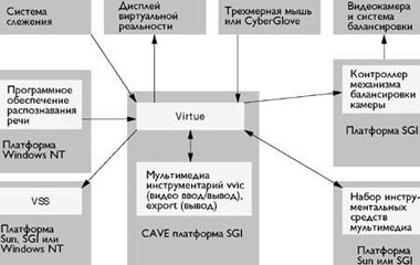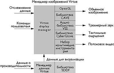 Ядро Virtue состоит из менеджера данных, который поддерживает описания данных и управляющих команд на языке SDDF, а также менеджера изображений, координирующего взаимодействия пользователей и выполняющего визуализацию. Для совместной работы и аннотирования набор мультимедиа инструментария координирует многоадресное аудио и видео и управляемые пользователями камеры. Созданный в National Center for Supercomputing Applications (NCSA) сервер Vanilla Sound Server (VSS) поддерживает ориентацию звука в пространстве, воспроизведение звука и генерацию аудиосигналов. Библиотека VRCO CAVE и OpenGL обеспечивают графическую поддержку, а библиотека CyberGlove дает пользователю возможность вносить изменения и в ответ испытывать тактильные ощущения с помощью Virtual Technologies CyberGlove. Наконец, коммерческое программное обеспечение распознавания речи позволяет отдавать голосовые команды.
